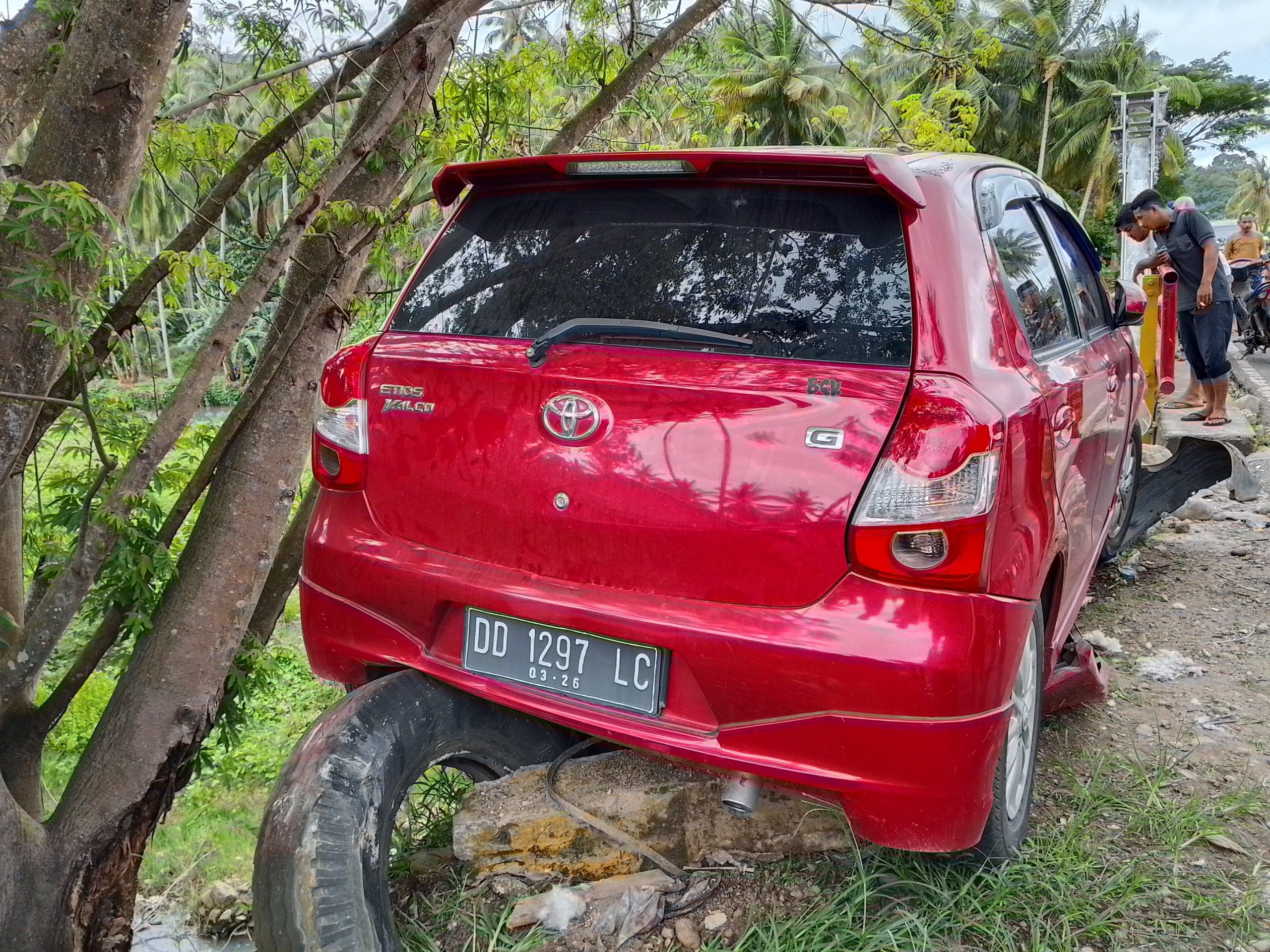 Namun tiba-tiba mobil sedan minibus Toyota Etios warna merah dari arah mamuju tiba-tiba oleng dan langsung menabrak pengendara motor.