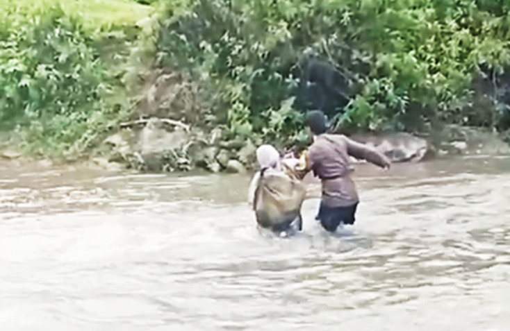 Curah hujan tinggi yang mengguyur kawasan tersebut dalam beberapa hari terakhir menyebabkan sungai meluap dan arusnya menjadi deras, sehingga membahayakan warga yang hendak menyeberang.
