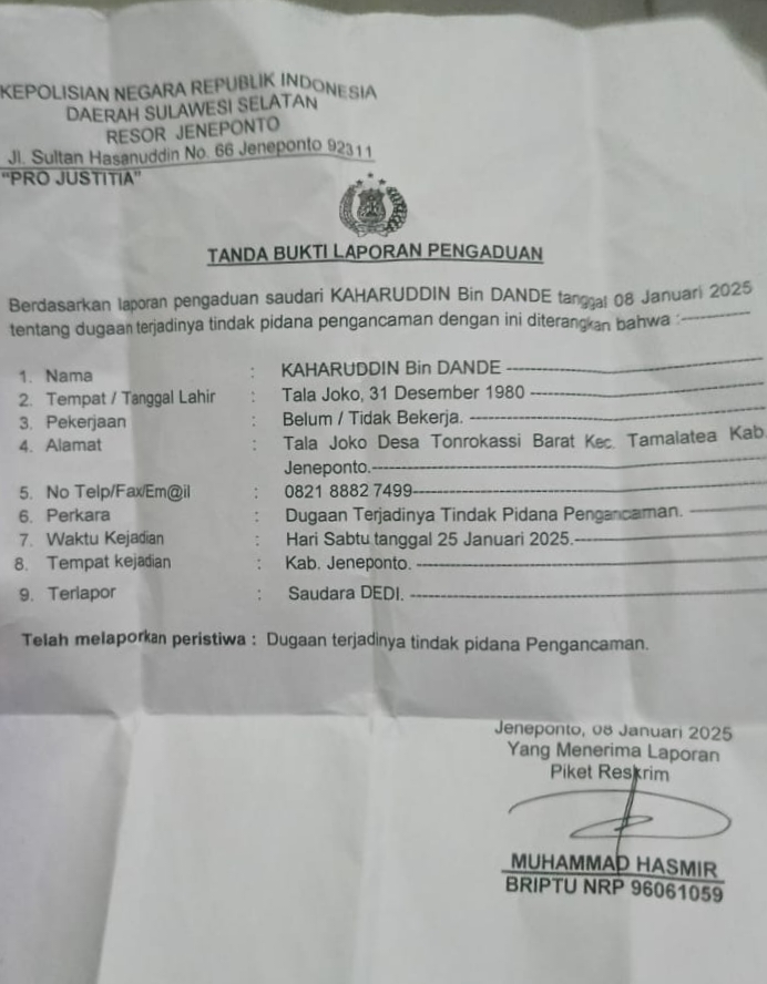 Jeneponto Sulsel, Tarantulanews.com — Seorang warga Kabupaten Jeneponto, Kaharuddin Bin Dande, tak henti-hentinya memperjuangkan keadilan setelah mengajukan laporan pengaduan terkait dugaan tindak pidana pengancaman yang dilakukan oleh seorang pria bernama Dedi. Meskipun insiden tersebut terjadi hampir setahun lalu, tepatnya pada 25 Januari 2024, laporan resmi baru diajukan pada 8 Januari 2025, namun proses hukum yang berjalan lambat membuat Kaharuddin merasa terancam dan khawatir keselamatannya terabaikan.
