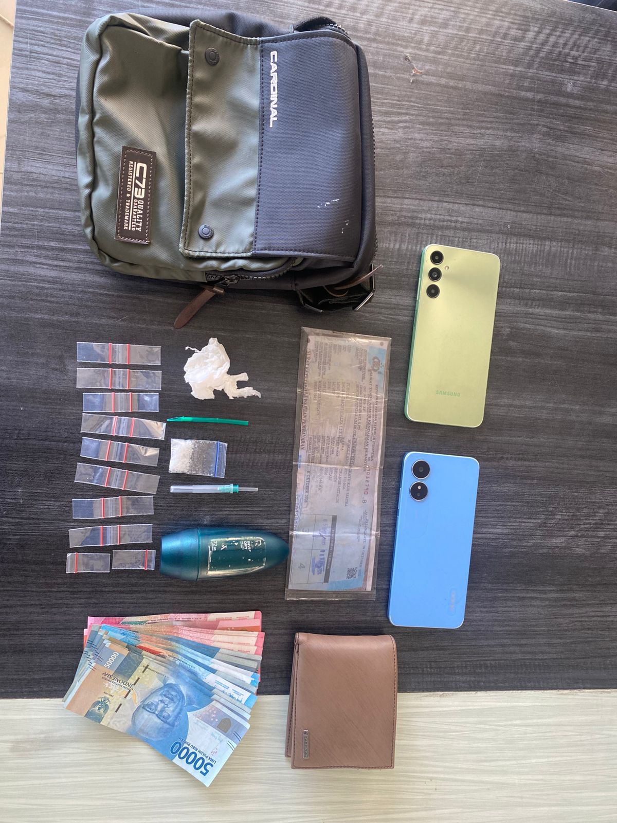 Barang bukti yang diamankan meliputi satu sachet berisi kristal bening diduga sabu, 18 sachet kosong, dua telepon genggam, kemasan Rexona, pipet, jarum suntik, sebuah mobil, dan uang tunai sebesar Rp 1.200.000.