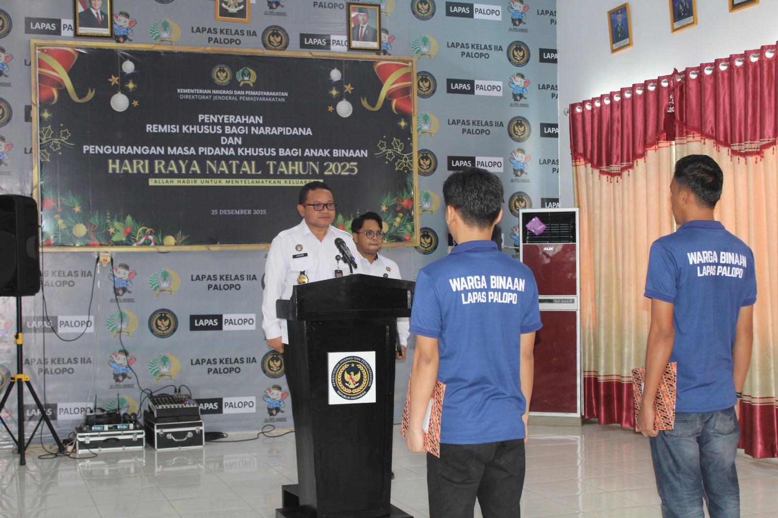 Tarantulanews.com|Palopo — Dalam rangka memperingati Hari Raya Natal Tahun 2025, Lembaga Pemasyarakatan Kelas IIA Palopo melaksanakan kegiatan Penyerahan Remisi Khusus bagi Narapidana serta Pengurangan Masa Pidana Khusus bagi Anak Binaan, Kamis (25/12/2025), bertempat di Aula Lapas Kelas IIA Palopo.